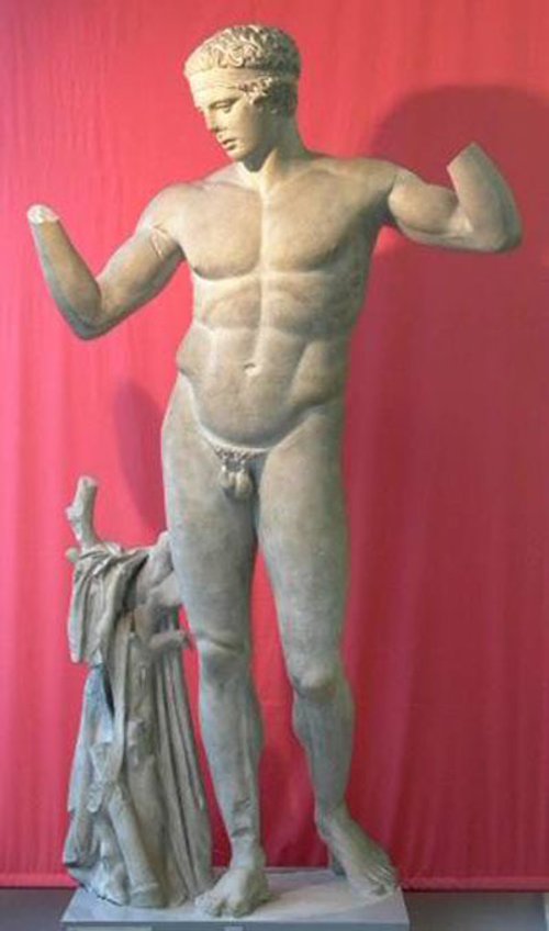 “The Diadumenos (“diadem-bearer”), together with the Doryphoros and Discophoros, are the three most famous figural types of the sculptor Polyclitus, forming three basic patterns of Ancient Greek sculpture that all present strictly idealised representations of young male athletes in a convincingly naturalistic manner.”